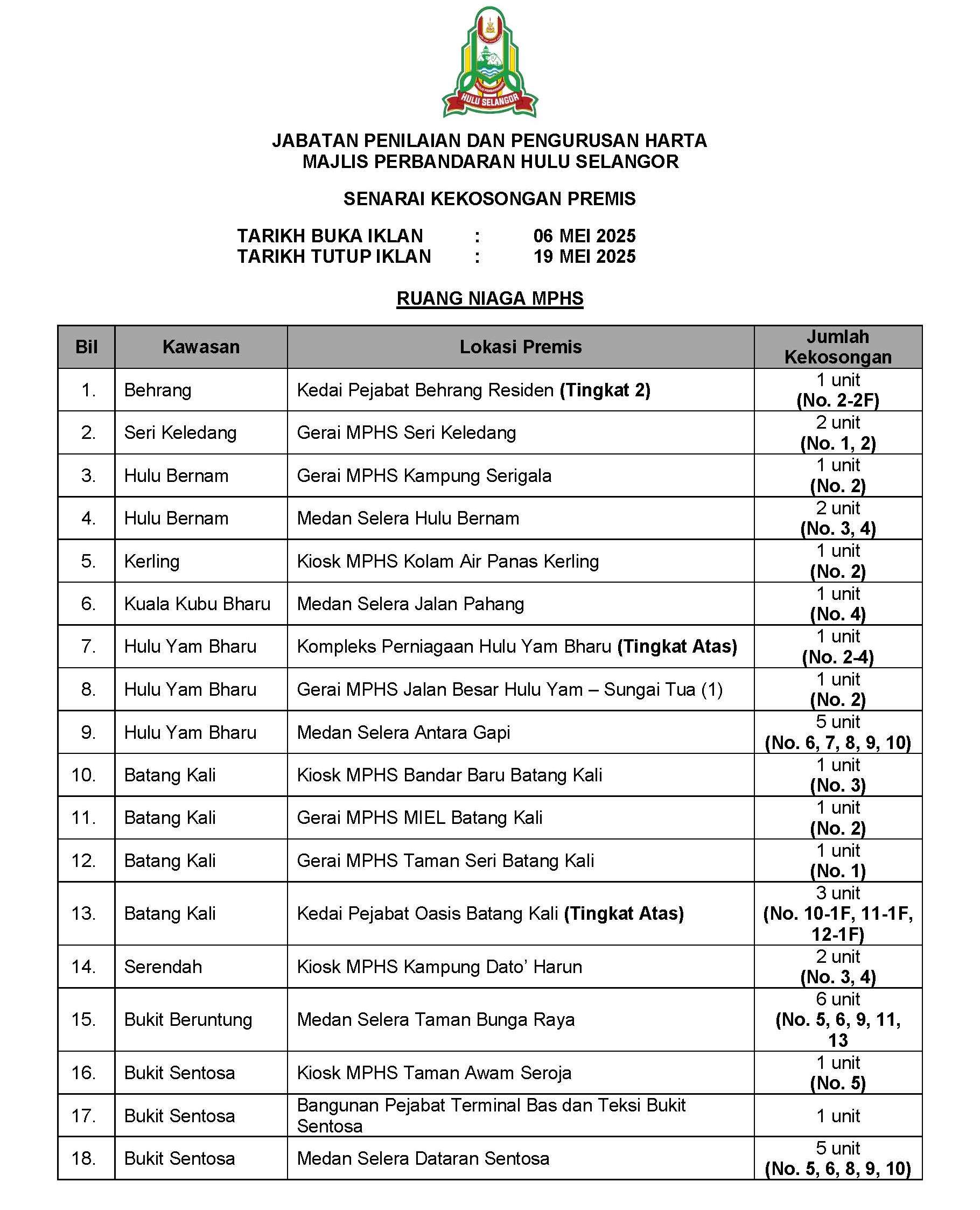 Quotation documents can be obtained by downloading from the website https://tender.selangor.my/. For more information, please contact the Procurement Division at 03-60641331 / ext. 113