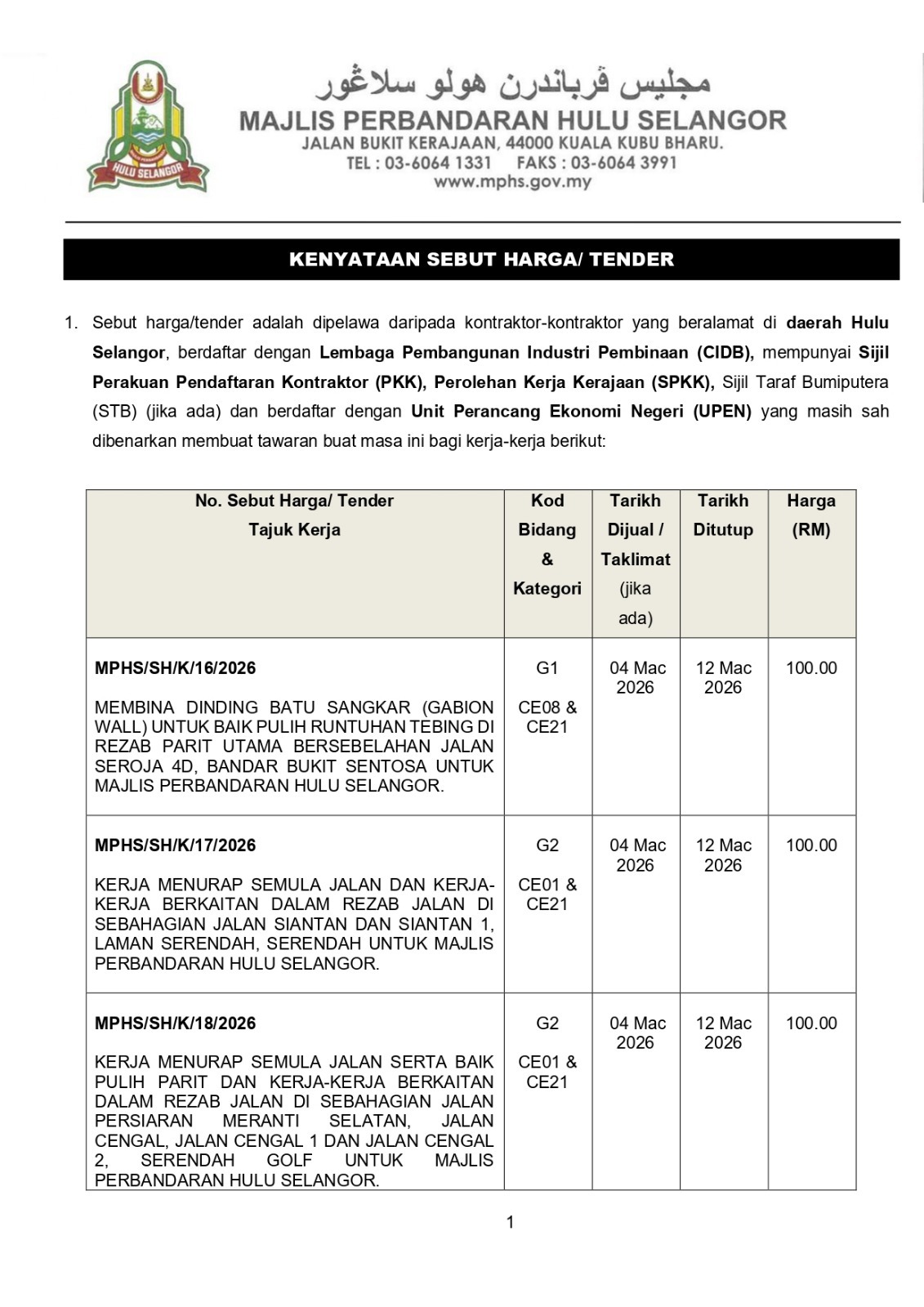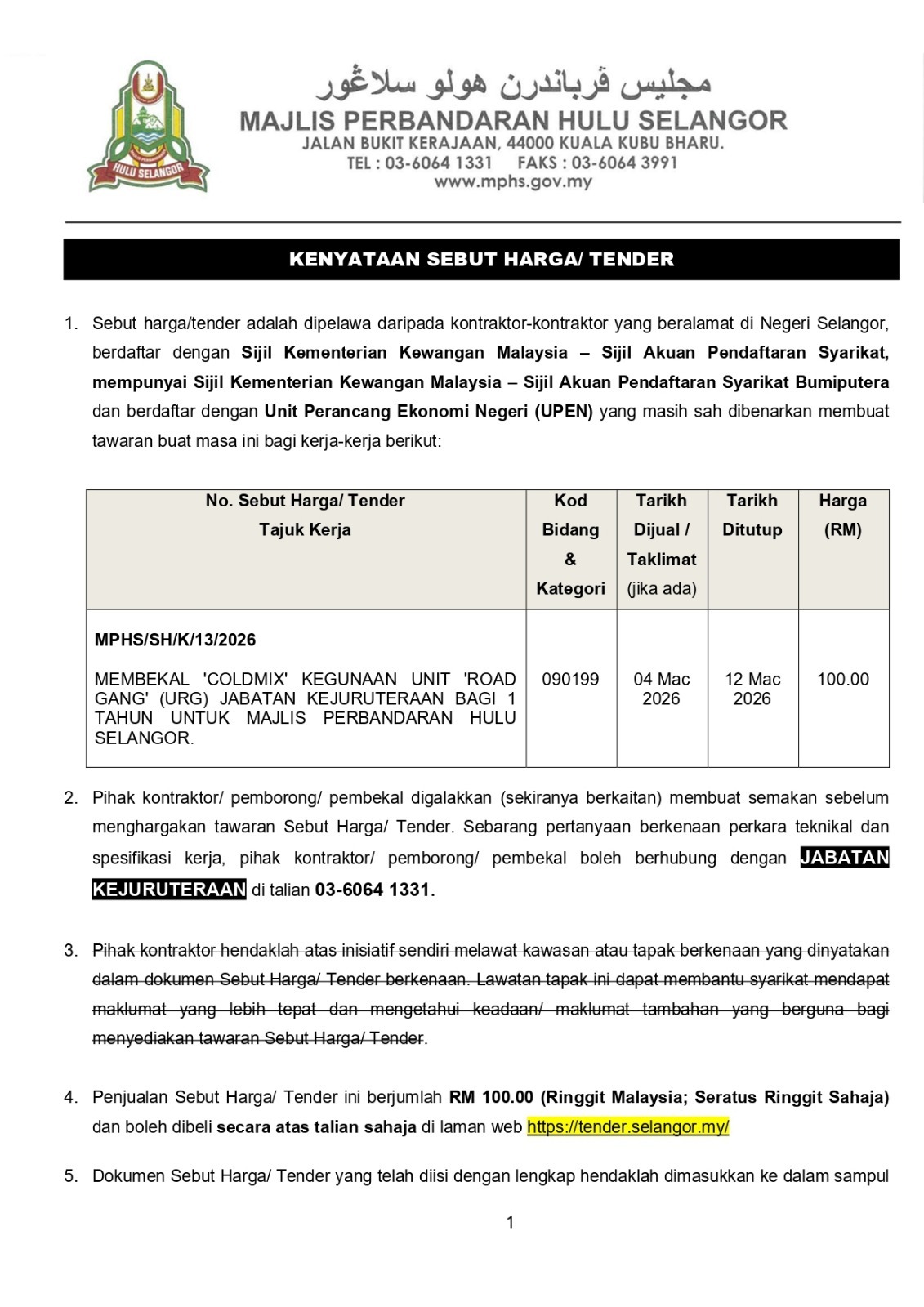 09 Mac 2026 : Notis Kenyataan Iklan Sebut Harga bagi perolehan di Jabatan Kejuruteraan, MPHS.