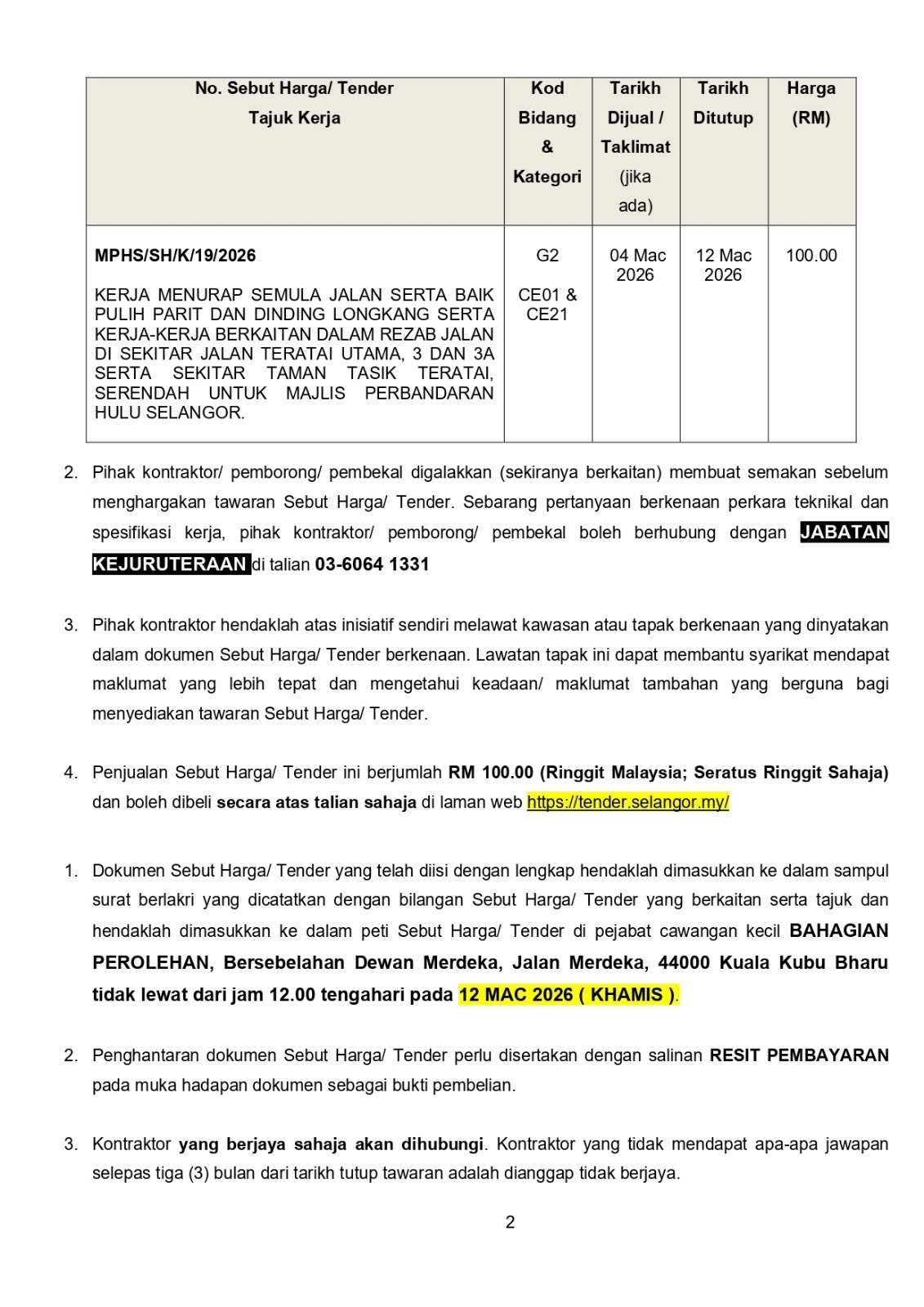 Untuk keterangan lanjut, sila layari https://tender.selangor.my/ atau hubungi Bahagian Perolehan di talian 03-6064 3869.