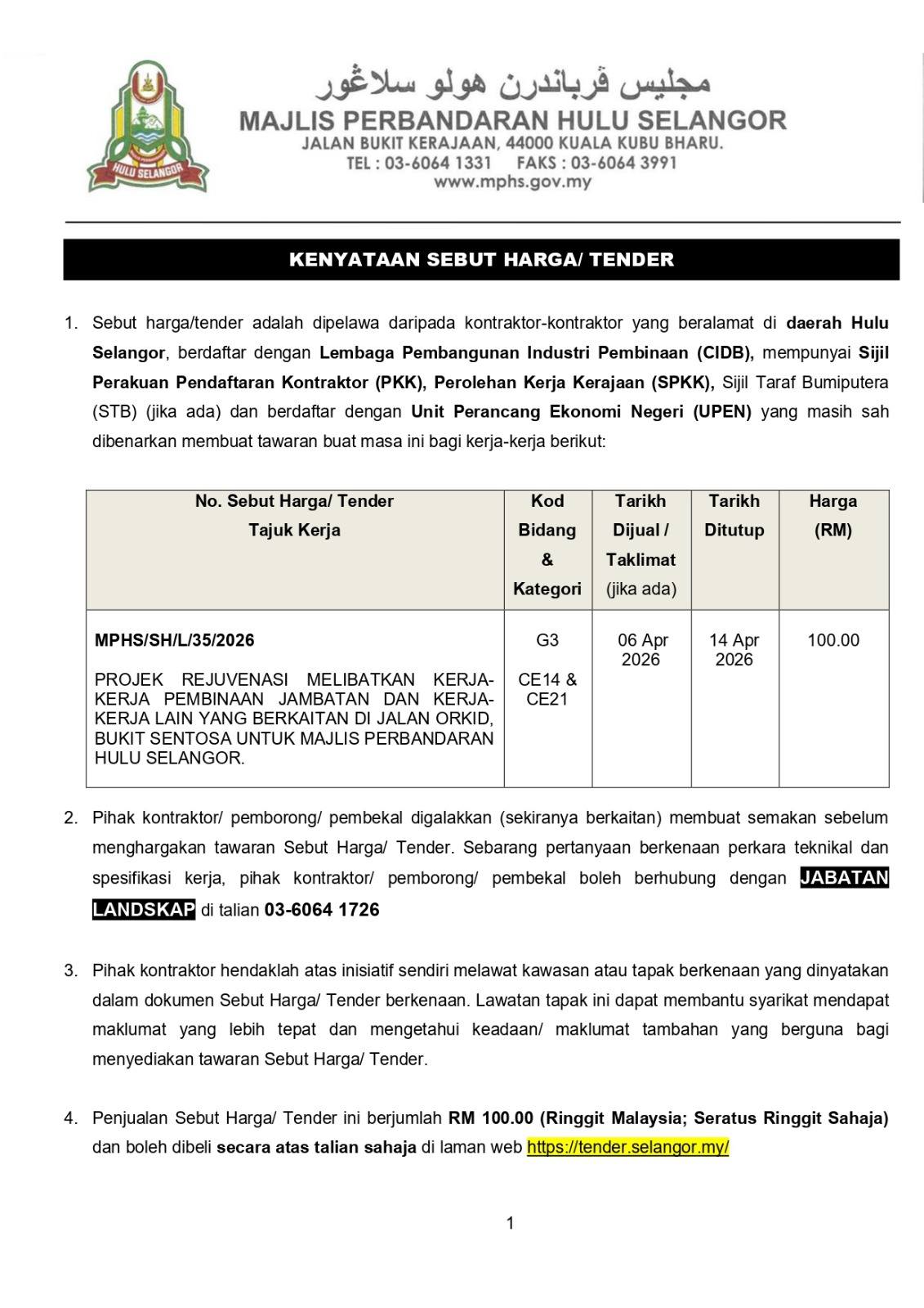 06 April 2026 : Notis Kenyataan Iklan Sebut Harga bagi perolehan di Jabatan Landskap, MPHS.