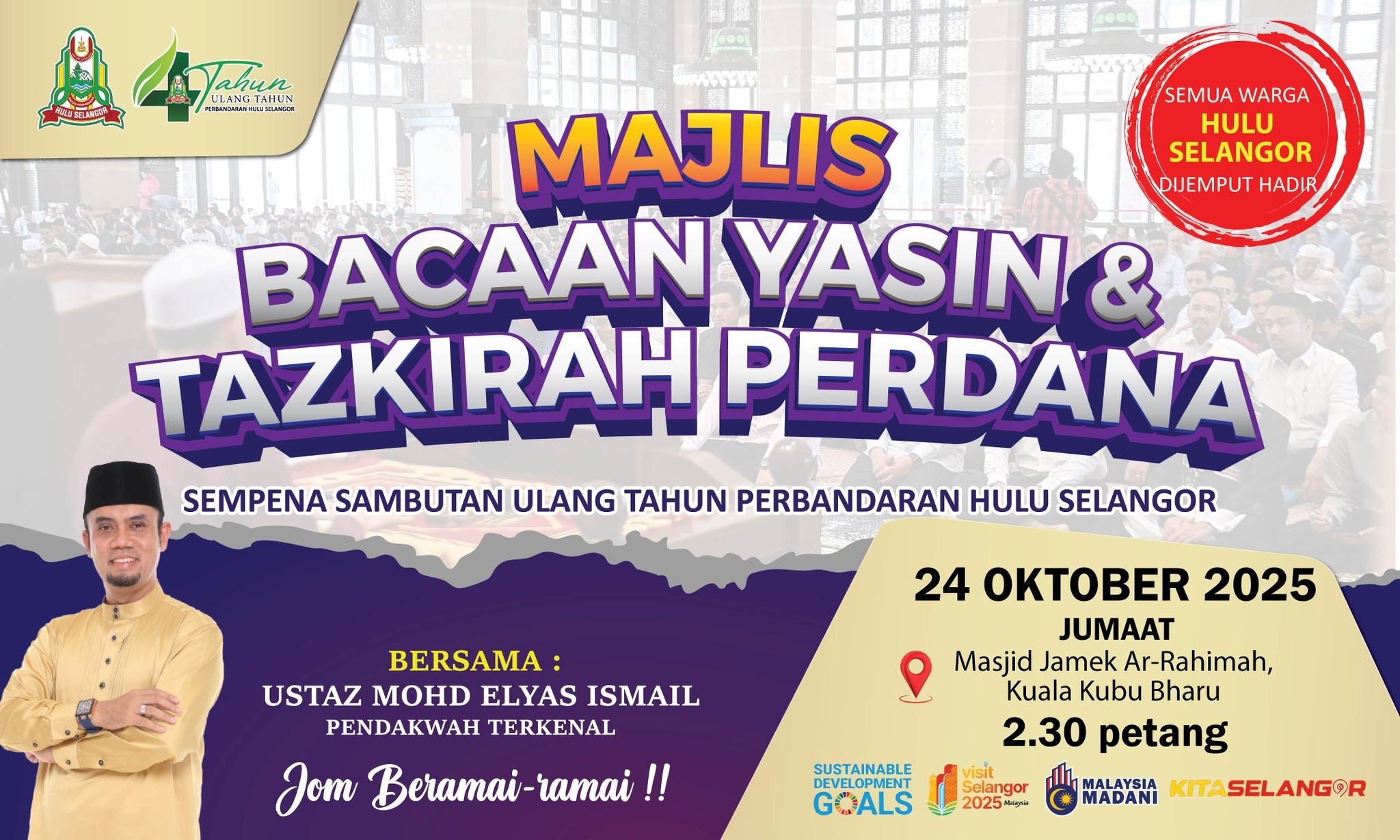 Jom bersama-sama memeriahkan Ulang Tahun Perbandaran Hulu Selangor 2025 dengan pelbagai aktiviti menarik sepanjang bulan Oktober ini!